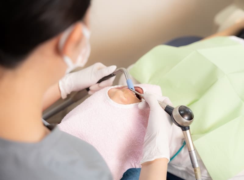毎日のブラッシングでは取りきれない細菌の膜や、コーヒー・紅茶などによる着色を除去できます。歯を擦って磨く方法ではないため、表面を傷つけにくいのが特長です。歯と歯の間や溝の奥まで届き、クリーニング後はお口全体がすっきりします。 -